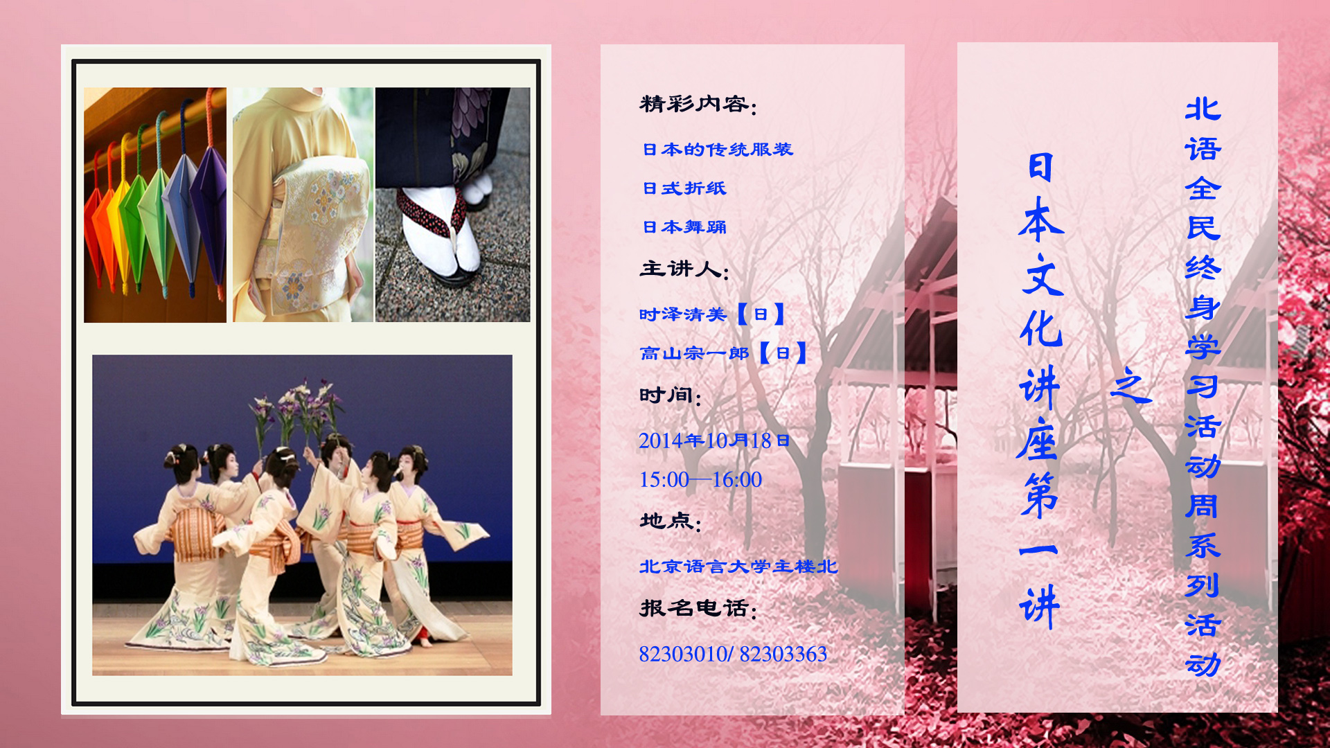 和服——日本的传统服装,有着怎样的发展历史?如今有哪些场合需要着和服出席?日本多样的折纸,含有怎样的文化内容?日本的舞踊,和歌舞伎又是一回事吗?来自日本的文化传播大使时泽清美和高山宗一郎将和您一同走进日本的文化,带您体验和服的穿法、折纸的乐趣,观赏舞踊的表演!