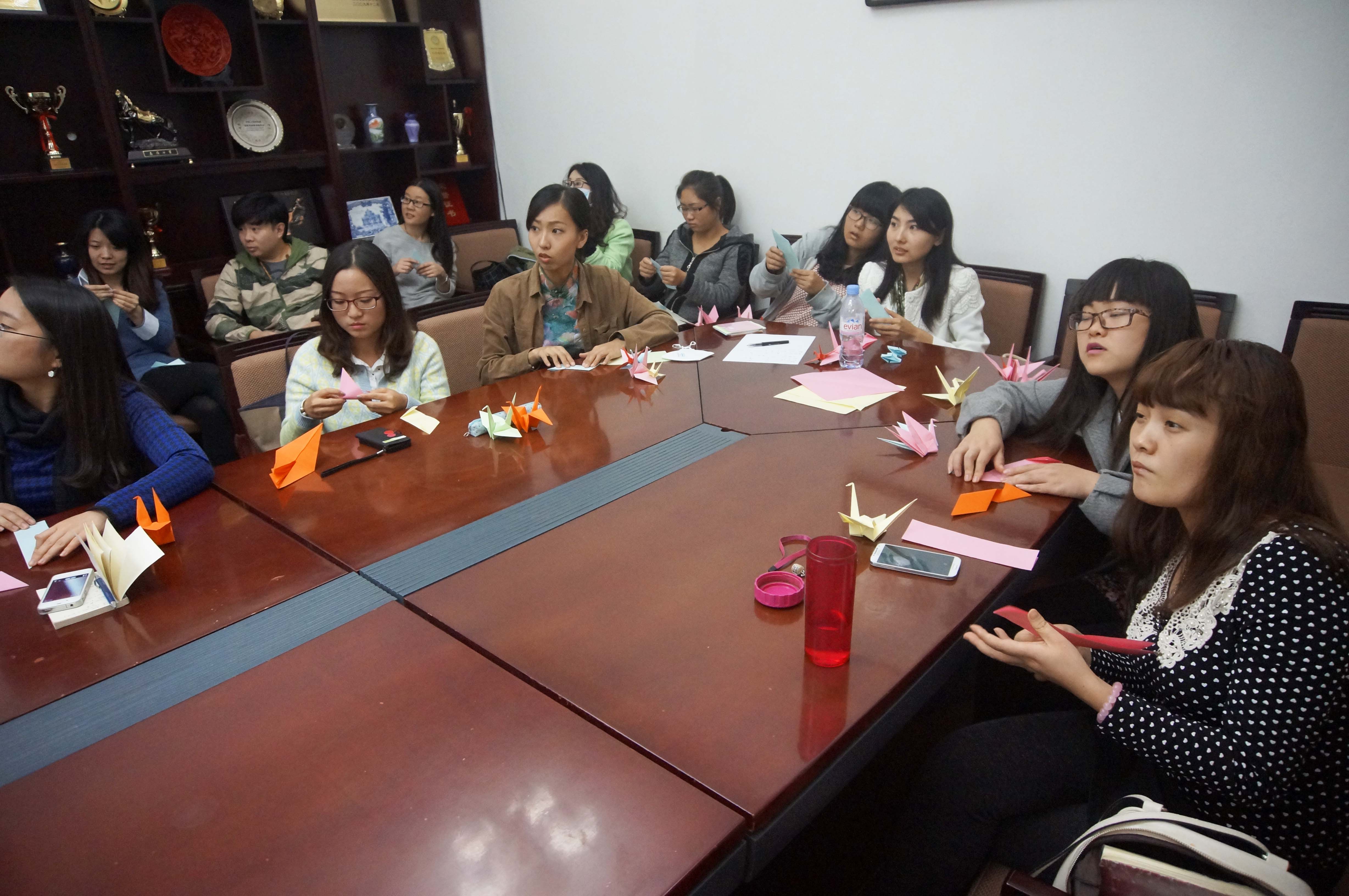 我院邀请了两位日籍友人时泽清美和高山宗一郎担任本次讲座的主讲人。他们从日本的传统服饰——和服及浴衣、日式折纸和日本传统舞踊三个方面入手,现场挑选“模特”演示了浴衣的穿法,并带领大家一起折叠含有日本文化含义的折纸,讲解日本的舞踊。学员们参与积极性高、互动气氛热烈。