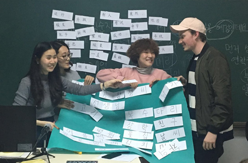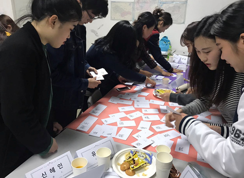 3月30日周四晚,在北京语言大学培训学院外语部韩语外教姜至恩老师的组织下,交流活动以比赛的形式展开,韩语中级班的9名学生组成的中国队,对战来自釜山外国语大学的9名交换韩国同学组成的韩国队。
