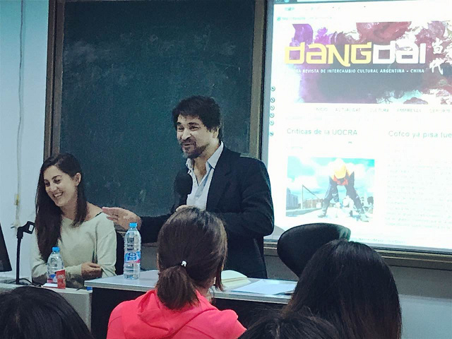 2017年4月20日晚在北京语言大学培训学院外语部的文化讲台上,来自阿根廷的知名媒体人Gustavo NG(伍志伟)先生做了一场别开生面的演讲。从中阿建交,到两国关系的发展,以及近年来中阿贸易的往来等方面,以一个在阿根廷成长的华裔视度,分享了很多亲身经历的故事。讲座由其好友,西、葡、英三语翻译Victoria女士主持。整个演讲过程非常精彩,席间学员们不时地报以热烈的掌声。
