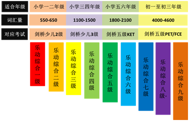 子乐青少外语乐动综合英语系列课程是专为“新课标”改革后的中小学生开设的百科全书式英语基础知识教学课程。从小学一年级至初中三年级共分为9个级别,采用美国培生原版教材Our Discovery Island和美音版《新概念英语》为主要教材,契合当前中小学教材的美式发音。