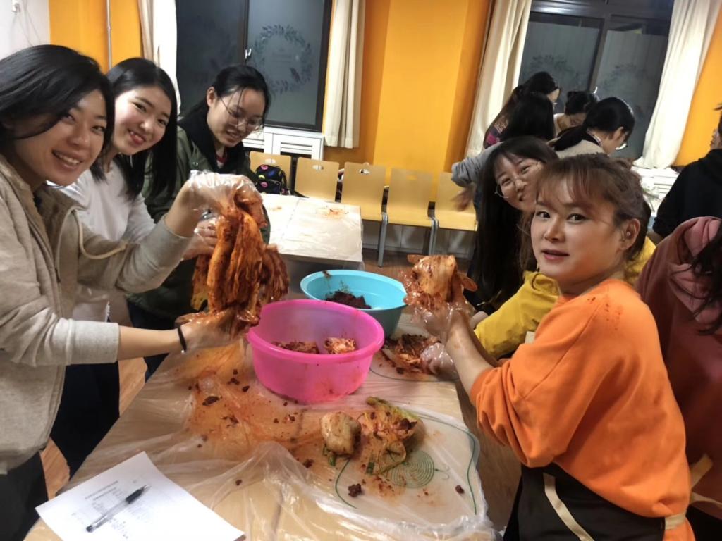 2019年3月27晚,培训学院外语部邀请到来自韩国釜山的李武熙女士为导师,来我院为学员们组织韩国文化体验之泡菜制作活动。李武熙女士首先为学员们讲解了韩国料理方面的语言知识和文化常识,之后把学生们分成小组,示范指导,手把手教学如何制作泡菜。 除了泡菜之外,李女士还演示了传统醇香的韩国经典菜式—泡菜配包肉的搭配做法,菜香四溢,现场充满了欢声笑语,热烈的气氛将这场味觉盛宴推向了高潮。