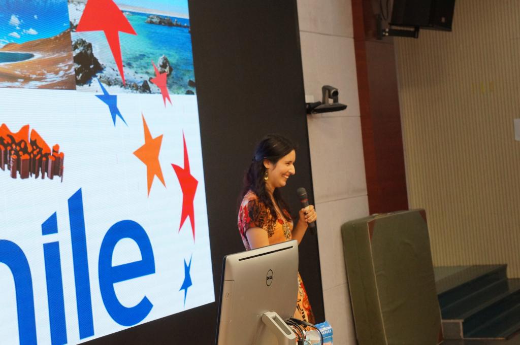 罗琳老师用数字表达法,介绍了智利的特征。比如智利有169座滑雪场、1200多个酒谷、1750座冰川、270多个温泉、2900多座火山等等。此外还通过精彩的视频和音频介绍了智利的野生动物和美食。从罗琳老师热情洋溢的讲座中可以感受到她对祖国深深的热爱之情。