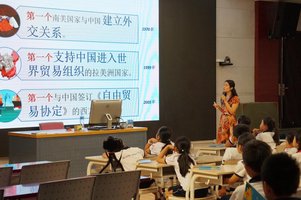 6月17日,来自智利的的罗琳老师走进了石油附小“我与祖国共成长 一带一路篇章”讲堂,为三年级80多名同学带来了一场精彩的讲座。