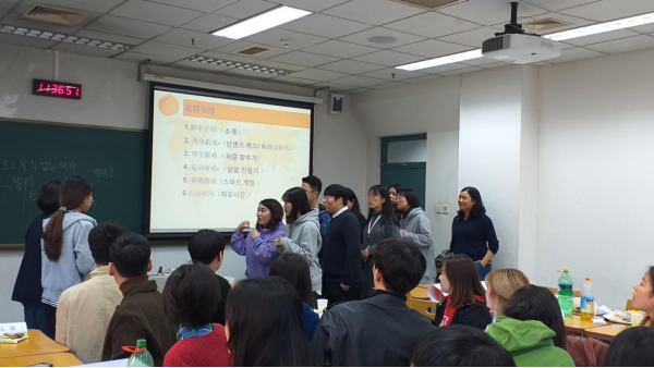 交流会一开始通过“形象游戏”来完成“找语伴”的活动。中国同学在小卡片上用韩文详细描写自己的外貌和穿着,韩国学生随意抽到这个卡片后,根据描写内容找到相应的中国语伴。接下来是“脑筋急转弯”(난센스퀴즈),通过这个游戏两国同学开始进入自由聊天的状态,加快熟悉彼此的同时学到新的知识。比如:哪个欧洲国家不“批发”? 回答:丹麦(单卖)。中韩学生同时学会“批发”(도매)这个词。