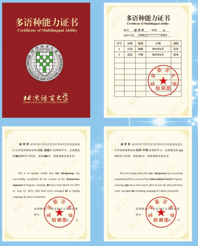 为响应社会对小语种人才直线上升的需求,北京语言大学培训部经广泛调研、潜心研发,特推出全国首个《多语种能力证书》。该证书开创并倡导了多门小语种能力的综合评价体系,是实用性强、应用广泛、利于识别人才的一种复合型水平认证方式。