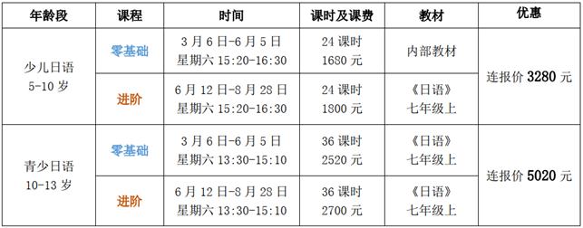 10-13岁青少日语使用人教版《日语》七年级,为《义务教育课程标准实验教科书日语》有七年级、八年级、九年级三册,每年级配一册。教材采用的新日语教育语法体系,致力于创设中国中学日语教学语法体系,以培养初步的综合语言运用能力为目标,学完可掌握日语语音基础、简单的日语知识和技能。教材注重从学生的生活经验出发、让学生有积极的情感体验和全身心的认知参与,注意开发学生的潜能,培养自学能力,帮助学生培养创造性思维能力。青少日语零基础班采用“七年级”,即第一册。