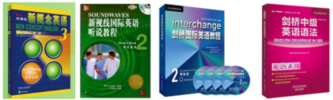 综合英语:《新概念英语》2 听说训练:《新视线国际英语听说教程》1 外教口语:《剑桥国际英语教程》1 语法(词法):《剑桥初级英语语法》 |