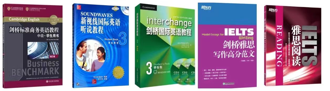 综合英语:《新概念英语》2 听说训练:《新视线国际英语听说教程》1 外教口语:《剑桥国际英语教程》1 语法(词法):《剑桥初级英语语法》 |
