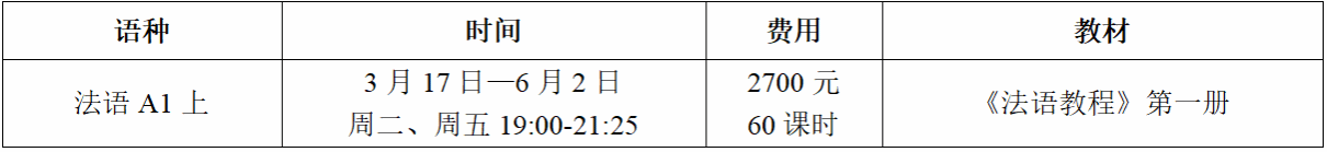 | 法语 | A1 周末班 | 5月16日-8月29日 周六9:00-12:10 13:30-16:40 | 5400元 120课时 | 《法语教程》 第一册 |