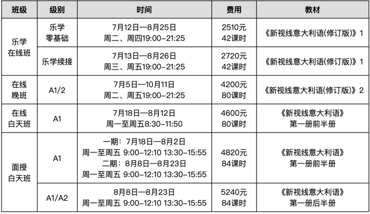 适合学员:零基础。对意大利语及其文化感兴趣,希望通过学习意大利语提高个人综合竞争力、出国进修音乐或艺术(如图兰朵计划、马可·波罗计划)、旅游和工作的学员(可开具使馆认可的学时证)。