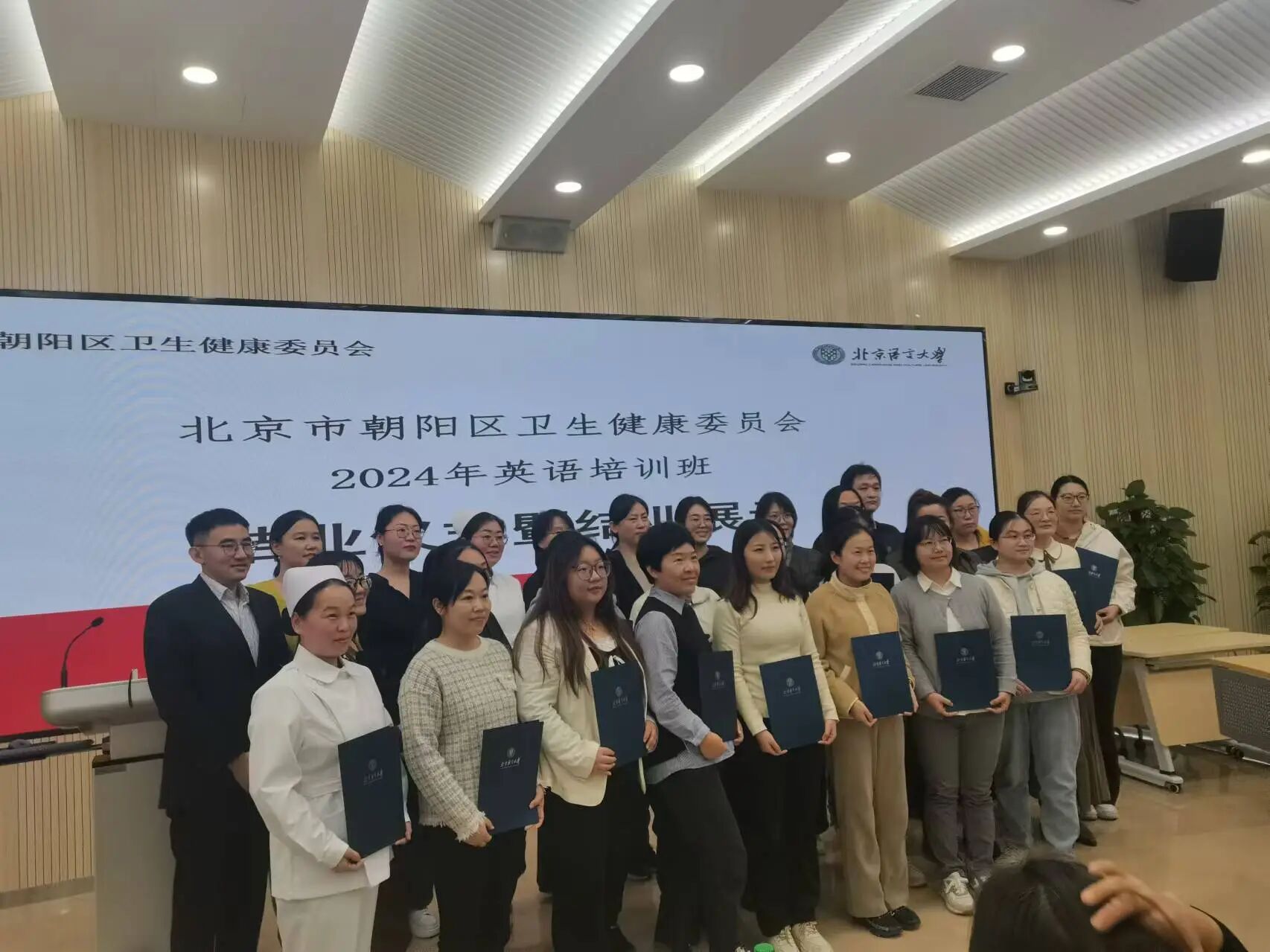 11月5日,北京市朝阳区卫健委联合北京语言大学成功举办2024年英语培训结业仪式。区卫健委政策研究室主任赵瑞萍、副主任潘叙如,区卫健委医疗机构管理中心副主任白伟,北京语言大学继续教育学院外语部主任马骁,本次培训教师、参训学员及学员所在单位代表参加了结业仪式。结业仪式由本期学员、来自崔各庄社区卫生服务中心的贺金鸣医师主持。