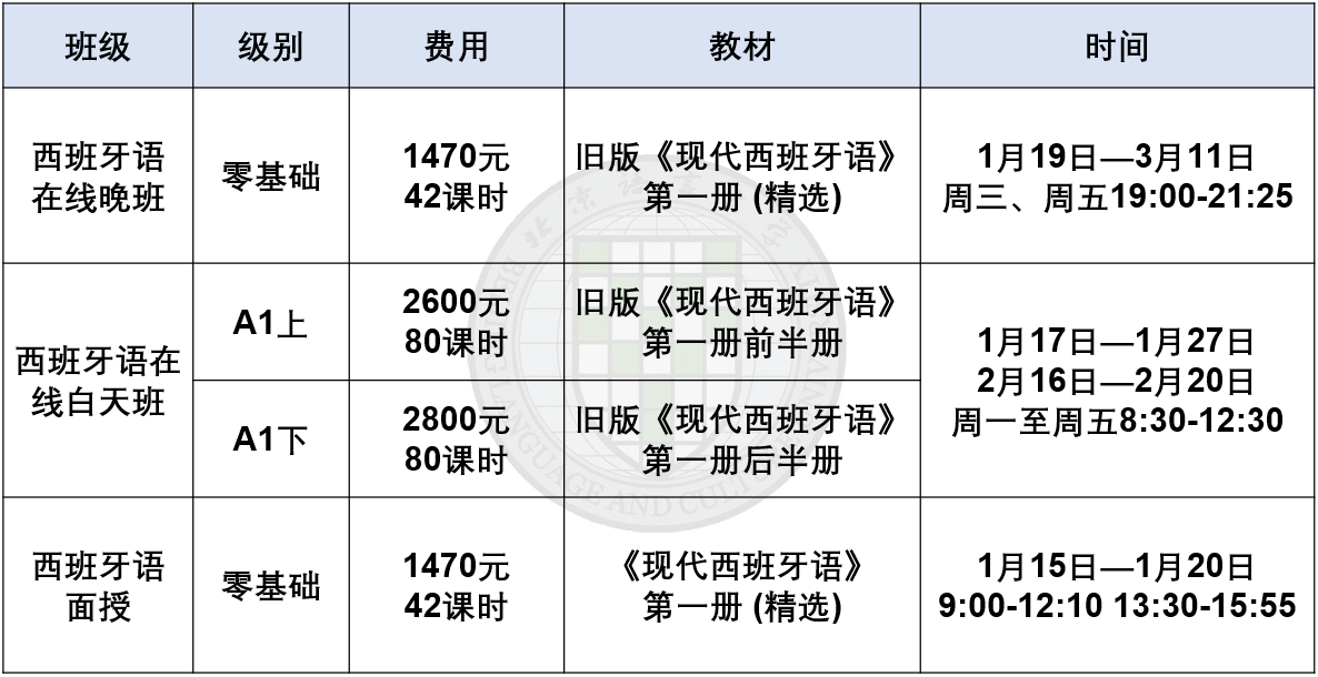 适合学员:零基础。对西班牙语及其文化感兴趣,希望通过学习西班牙语提高个人综合竞争力或有计划出国学习、旅游和工作的学员。